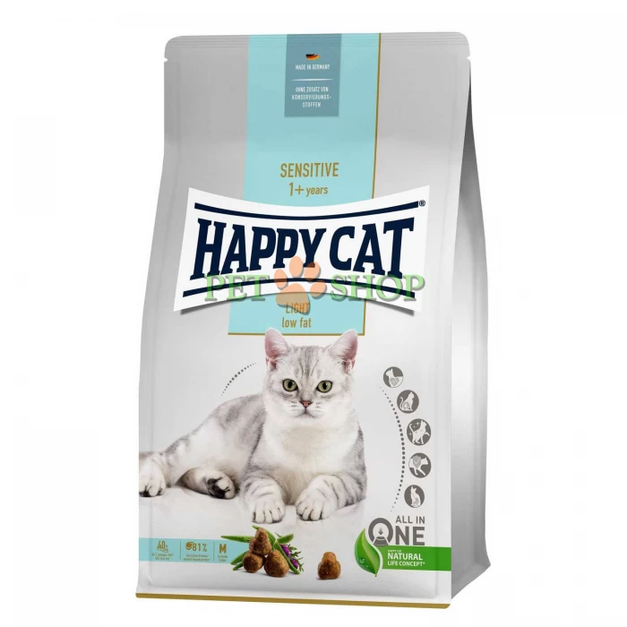 Happy Cat Sensitive Light este recomandat pentru a evita problemele de supraalimentare.