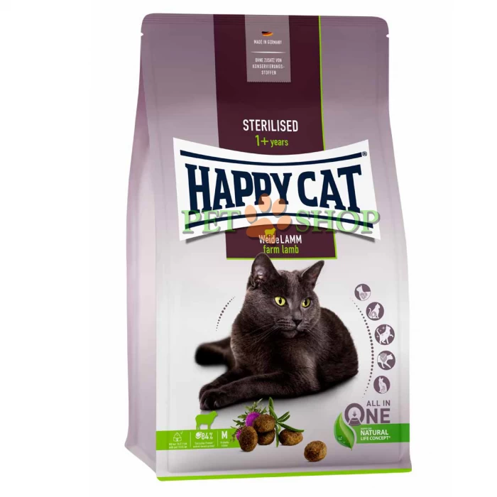 Happy Cat Adult Sterilized Weide-Lamm este special formulat pentru pisici sterilizate și sterilizate. Acest furaj hrănitor și gustos, bogat în fibre dietetice, conține doar 10,5% grăsime și o cantitate mare de proteine animale valoroase din carne de miel ușor digerabilă și carne de pasăre gustoasă.