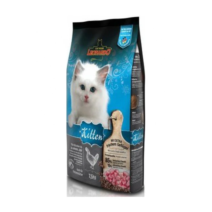Hrana uscata Leonardo Kitten cu pui pentru pisoi este o hrana sanatoasa pentru pisoi de pana la 1 an realizata din carne frageda de pui si produse lactate valoroase, care faciliteaza trecerea la hrana uscata. La pisoi, sistemul imunitar nu este încă suficient de dezvoltat, prin urmare, pentru a menține și întări apărarea organismului, Leonardo Kitten conține o combinație de componente valoroase ProImmun, precum și extract de drojdie și semințe de in.